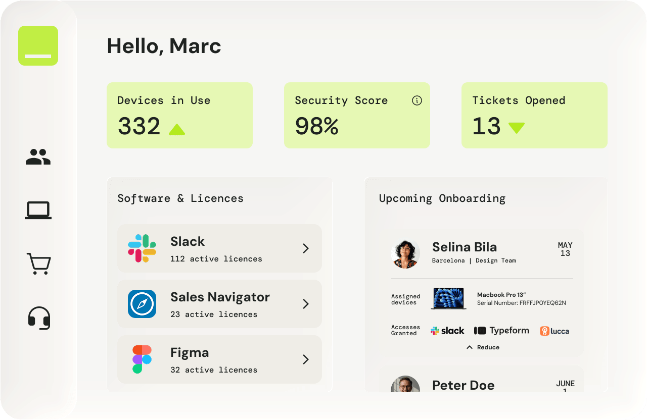 Through a platform connected to your HRIS tools, you can automate onboarding and offboarding, monitor your IT assets in real time, and delegate technical support — all while optimizing costs and strengthening security.