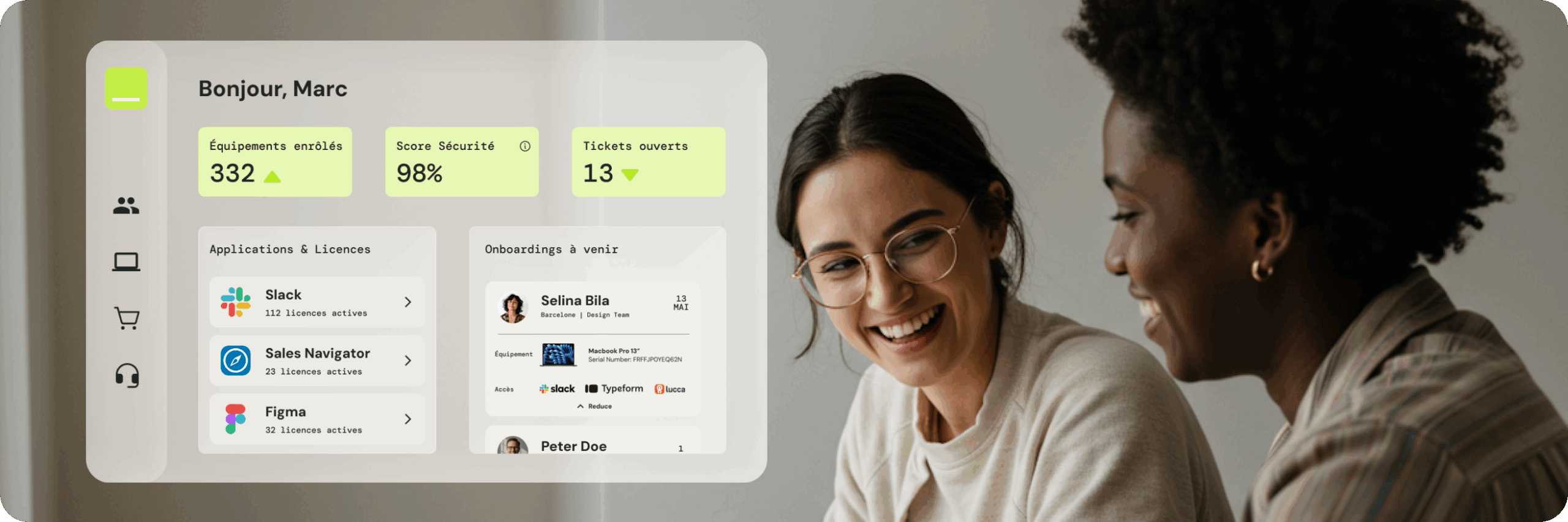 Grâce à une plateforme connectée à vos outils SIRH, automatisez l’onboarding et l’offboarding, suivez votre parc IT en temps réel et déléguez le support technique, tout en optimisant vos coûts et en renforçant la sécurité.
